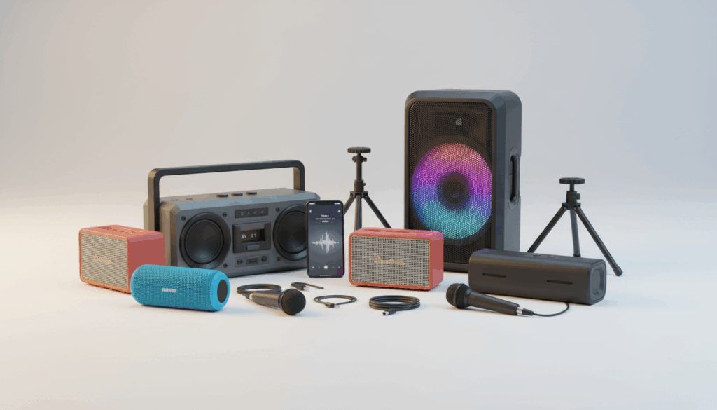 Bærbare Højttalere er batteridrevne, trådløse enheder, der giver god lyd til hjemmet, udendørs og på farten. Kategorien spænder fra små pockets til mellemstore boombox- eller party-modeller med flere drivere og ofte indbyggede mikrofoner. De fleste streamer via Bluetooth, men mange tilbyder AUX, USB-C og nogle gange NFC. Nogle modeller har vandtæthed, LED-lys og karaoke- eller talefunktioner, mens andre fokuserer på ren bærbarhed og fremragende lydkvalitet. Ved køb: batterilevetid, vægt og størrelse, lydstyrke, tilslutninger og holdbarhed er afgørende. MAXiPRO og MIIEGO-modeller viser bredde og variation i kategorien.