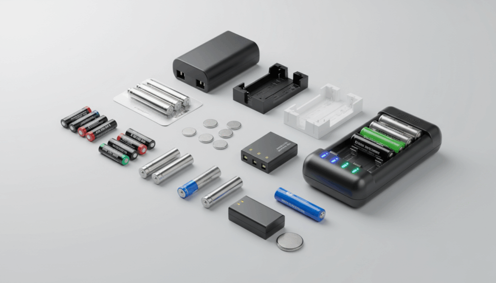 Typiske variationer inkluderer AA/AAA alkaliske, knapcellene CR2032, Li-ion 18650 og kamera-batterier som NP-FZ100 eller EN-EL12. Batteripakker til værktøj eller UPS findes også i sortimentet.