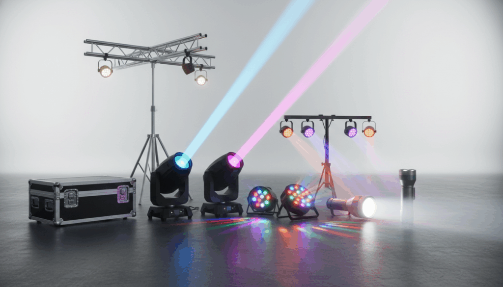 Ved køb bør du vurdere lysstyrke og effektniveau, beamvinkel, farvemuligheder og kontrol. DMX-kontrol giver præcis synkronisering, mens auto-tilstande og IR-fjernbetjening giver hurtig opsætning. Cross-beams og sæt til mobile shows kræver robust konstruktion og transportløsninger, og nogle modeller kommer som komplette sæt med flightcase for nem håndtering.