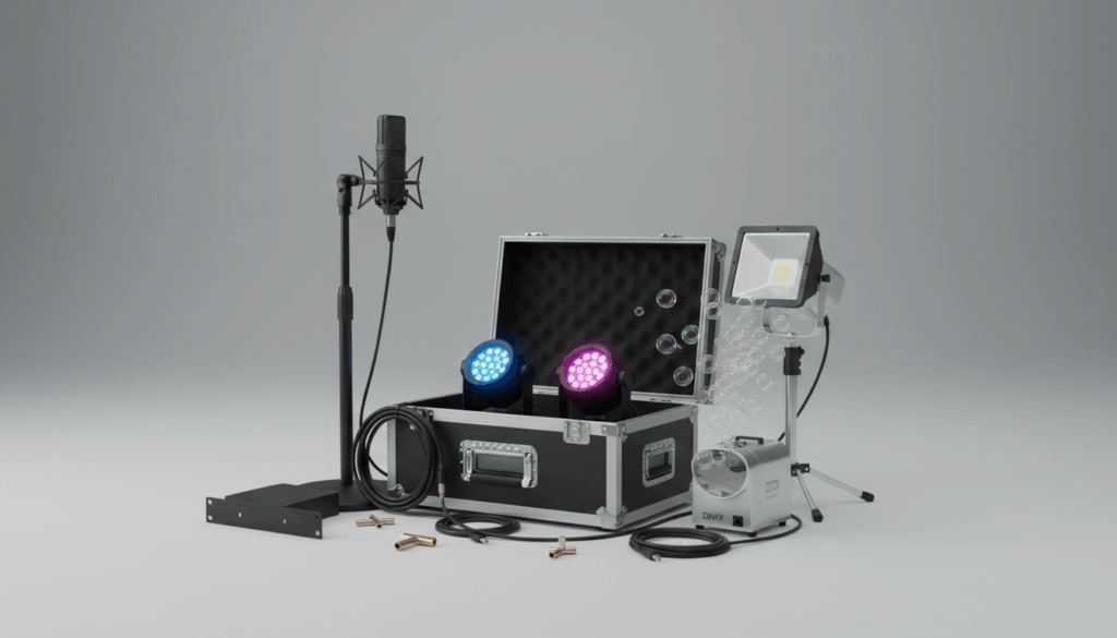Variationer inkluderer LED IP PAR-sæt, enkeltlamper og halogenpærer samt scenetilbehør som L-stykker og T-stykker. Til transport findes flightcases og robuste stativer, mens shockmounts fuldender lydmiljøet. Se udvalget hos Disconetto og Elvvs.