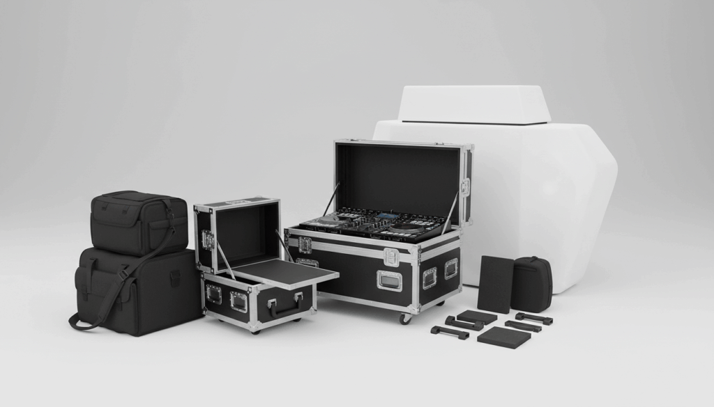 Typiske variationer inkluderer flightcases til Denon SC Live 2, Pioneer XDJ-XZ og 19-tommer mixer med 2 CDJ'er, samt lettere letvægts pult-cases til mobile setups. Der findes også transportcovers til subwoofere og højttalere. Ved køb bør man måle udstyret og tjekke indre mål, låse og udtrækshylde for komfort og sikkerhed.