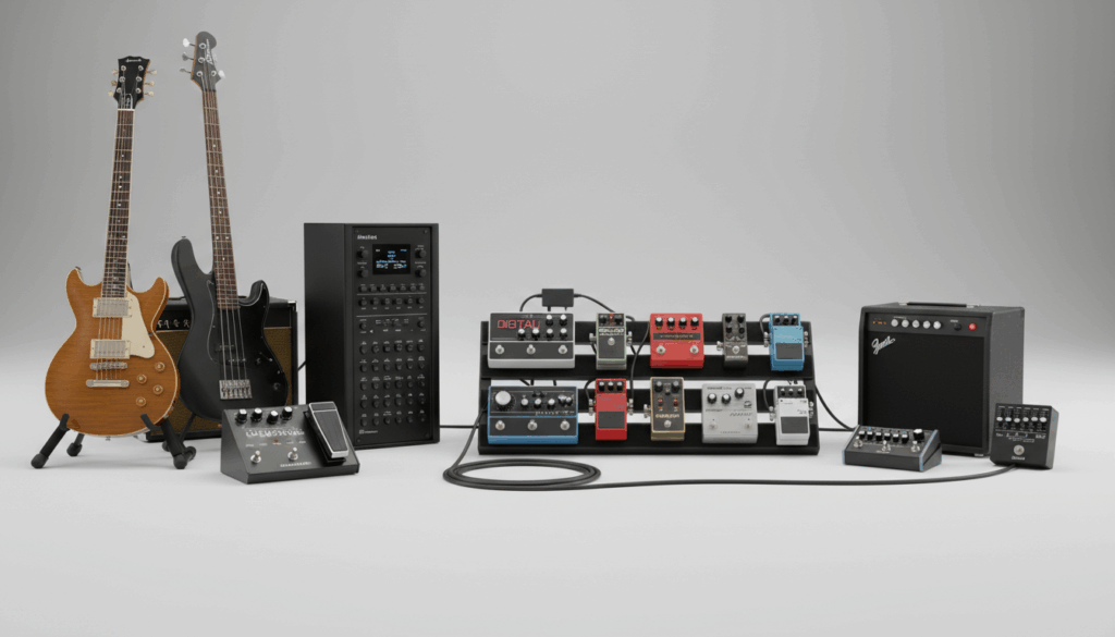 Effekter og Processorer samler en bred vifte af lydbehandlingsenheder, der former, forvrænger og forstærker lyden fra guitarer, baser og andre instrumenter. Her finder du alt fra pedalboard-pakker og analoge/digitale delay- og reverb-pedaler til distortion, modulering og pitch-effekter, samt mere komplette multi-effekt-enheder og grafiske eller parametiske EQ'er. Kategorien omfatter også forforstærkere, harmonikere, skilletrafoer og forskellige typer effektforstærkere og PA-løsninger til live- og studiebrug. Ved køb bør du overveje type (analog vs. digital), antallet af effekttrin, true bypass, lydkvalitet og støj, samt hvor let en enhed er at redigere og gemme presets. Variationer inkluderer pedalboard-pakker, rack-mount processorer og akustiske multi-effekt-enheder, der giver omfattende kontrol over din lyd. Til inspiration kan du se konkrete modeller fra samarbejdspartnere som Disconetto og Music2you.