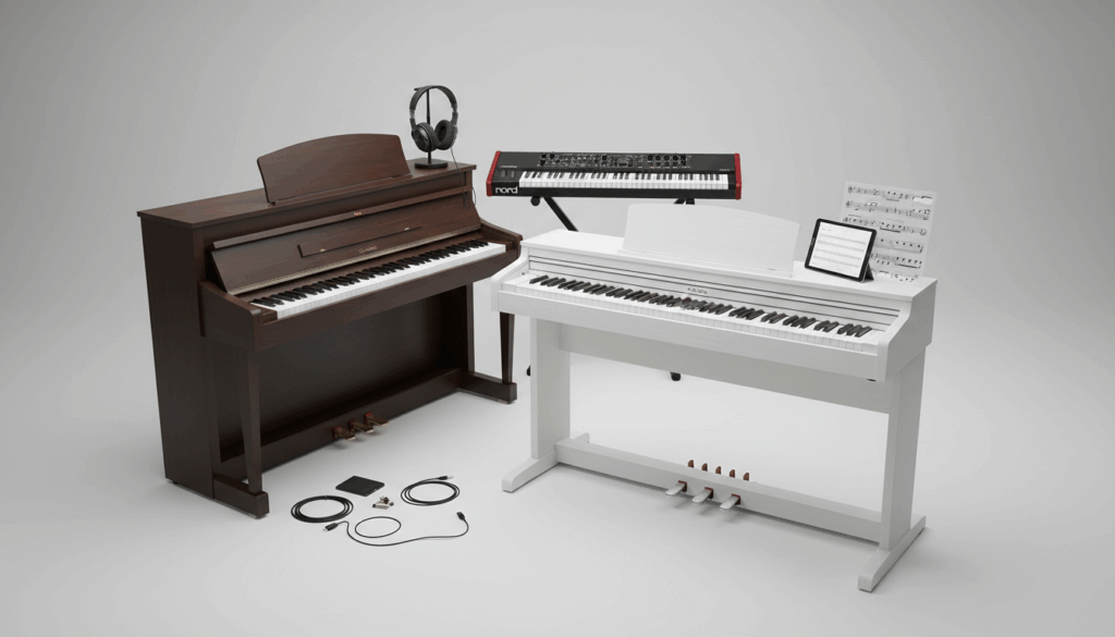 Tilslutningsmulighederne er ofte omfattende: USB, MIDI og audio-udgange, og nogle enheder har indbyggede højttalere til hjemmebrug, mens andre fungerer som lydmoduler. Når du vælger, bør du overveje tangentens fælelse, lydkvalitet, antal lyde og polyfoni, størrelse og vægt samt behov for stativ, pedaler og opdateringsmuligheder. Variationer som Casio Privia og Celviano eller Nord Piano dækker alt fra begynder til professionel brug. For et bredt udvalg se Music2you.