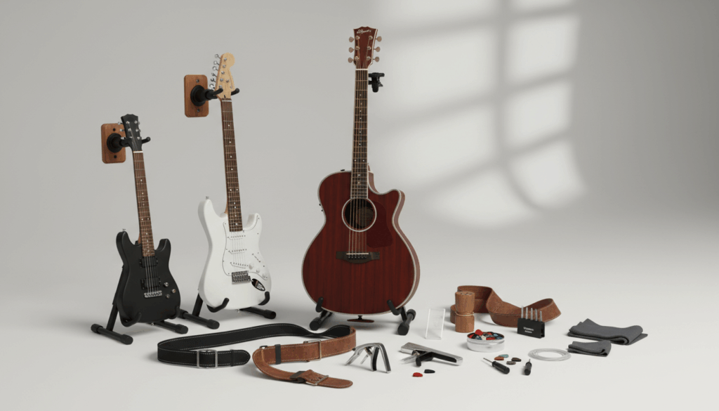 Variationen spænder fra begyndervenlige sæt til robust pro-udstyr: plektre og slides (metal, akryl, nylon), afstemningsværktøjer, jack-plade og andre reservedele. Materialer påvirker komfort, holdbarhed og tone.