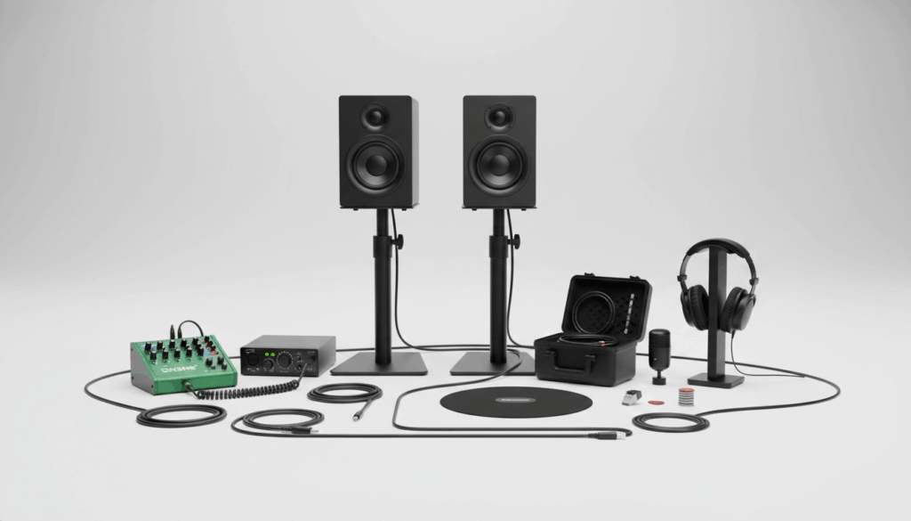 Udvalget spænder bredt fra pladespiller-tilbehør som headshells, pickups og stylus til pladevedligeholdelse og optimering. Til studie og live finder du forstærkere, lydkort, rumkorrektion og isolatorer, samt mikrofon-tilbehør og praktiske monteringselementer til mixere og sceneborde. Variationerne gør det muligt at sammensætte en komplet løsning til hjemmestudie, øvelokale og scenekoncerter.