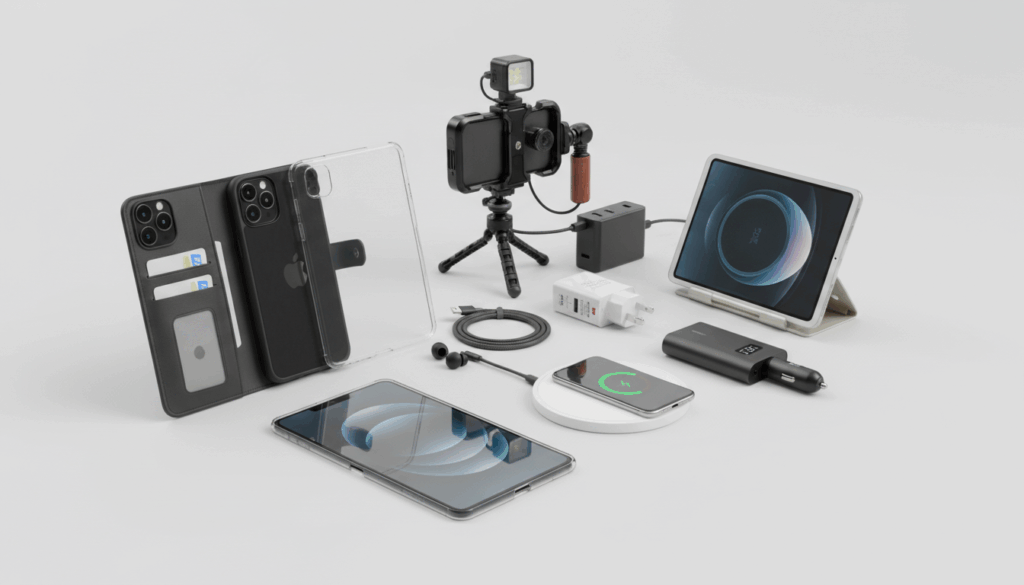 Til opladning og rejse findes bil-ladere, rejseadaptere, USB-C og USB-A oplader-sæt, samt trådløse opladere og powerbanks. Til foto og video findes håndtag og cages, der giver stabilitet ved optagelser. Se udvalg fra MAXiPRO og Proshop.dk for bredde og kvalitet.