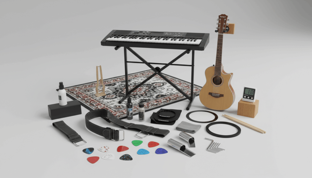 Musikinstrument Tilbehør dækker alt nødvendigt udstyr, der gør dit musikliv nemmere, sikkert og mere effektivt. I denne kategori finder du guitar-tilbehør som plektre, slides, remme og straplocks, samt dele, vedligeholdelsesværktøj og plejeprodukter som klude, polering og rengøringsmidler. Til trommer og percussion findes tæppe, beskyttelsesringe til trommeskind og frontskind-tilbehør samt andet tilbehør, der forbedrer lyd og holdbarhed. Der er opbevaring, stativer og vægophæng til instrumenter, samt fugt- og temperaturmåling, der hjælper med at beskytte mod udsving. Variationerne spænder fra materialer som celluloid og nylon til forskellige designs og funktioner.