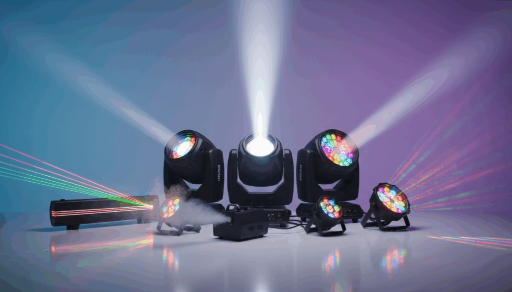 Udvalget spænder fra kompakte lamper til robuste løsninger til udendørs brug. Variationerne omfatter moving heads, LED-beam og wash, laserbarer og multi-effekter (4-i-1), stroboskop og hazers. Når du vælger, bør du overveje om de skal bruges indendørs eller udendørs (IP-klassificering), farvespektrum (RGBAW/UV), dæmpning og hastighed, samt hvilken kontrolform der passer dit setup (DMX, Master/Slave, automatisk kørsel).