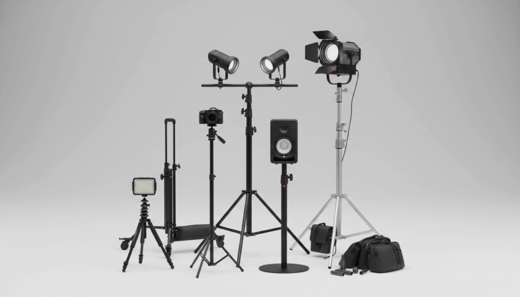 Når du vælger stativ, bør du tænke på maksimal belastning, højeste højde og om stativet passer til dit udstyr (28 mm spigot eller TV-pin Ø29 mm). Overvej transportabilitet, stivhed og muligheden for at montere flere lamper på en T-bar, eller bruge wind-up til tunge lamper og lydudstyr. Variationer inkluderer mobile push-up-stativer og mindre bordstativer til kamera og lys.