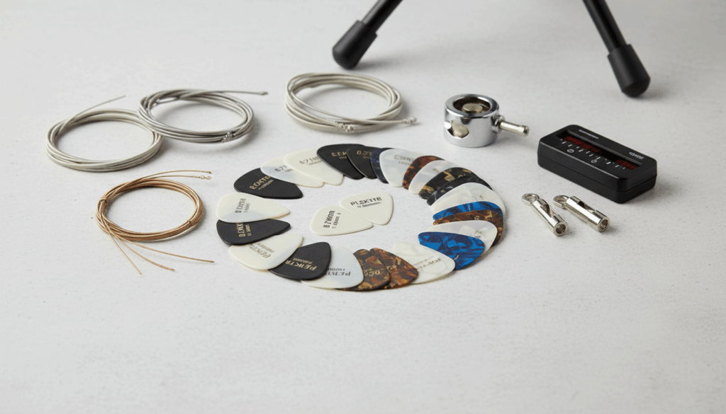 Strenge og Plektre samler alt til guitar og andre strenginstrumenter i én kategori: plektrer (guitar picks), guitarstrenge og en bred vifte af tilbehør som straplocks, strengevinder, finstemmer og stativer.