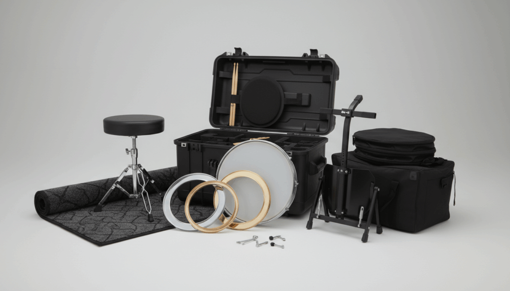 Når du vælger tromme-tilbehør, afstemmer du efter trommens størrelse og dit behov: 4-, 5- og 6-tommers ringe i krom eller messing, øvepads med realistisk respons, og robuste stativer eller carrier-løsninger til forskellige trommer. Husk komfortable trommestole og tæpper til at beskytte gulvet og give en god spilleposition ved lange sessioner. Til transport og opbevaring findes holdbare kasser og tasker, der tåler rejsen.